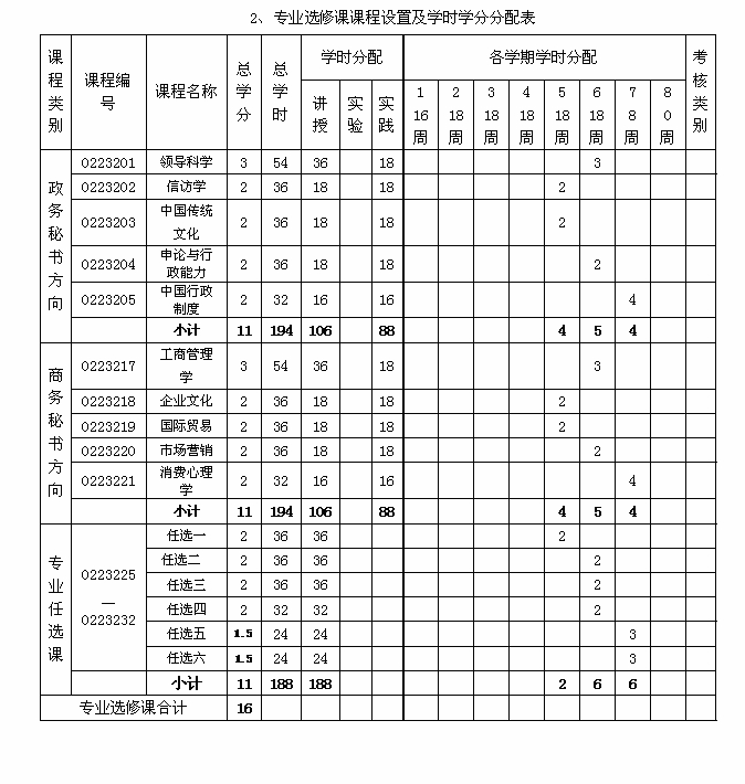 文秘教育专业选修课程设置表