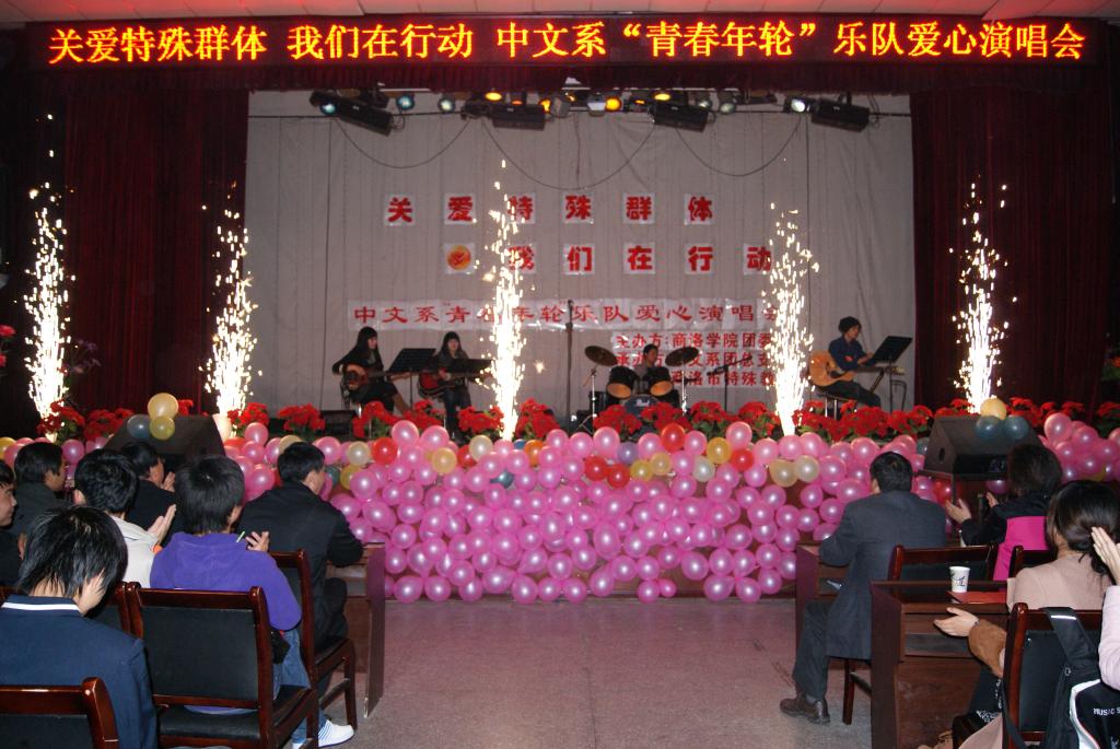 关注弱势群体,唤起人间真情。11月14日晚,由388vip太阳集团官网团委主办、中文系团总支承办、商洛市特殊教育公司协办的“青春年轮”乐队爱心演唱会在公司老员工活动中心成功举办。特殊教育公司董事长龙永贤、党委书记龙正治、团支部书记杨春,388vip太阳集团官网团委副书记蒋正治,中文系党支部书记张彦民、副主任刘勇、办公室主任陈炜、团总支书记黄璜等老师以及特殊教育公司、中文系其他师生及特殊教育公司全体师生观看了演出。