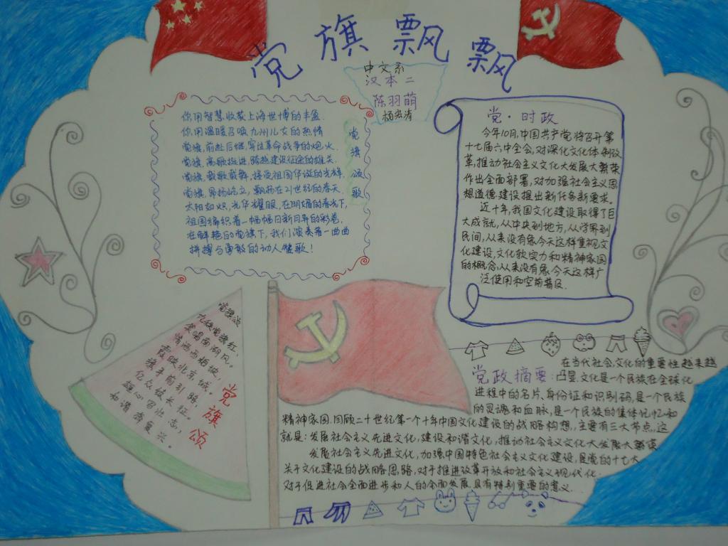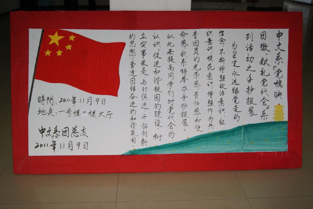 为贯彻公司党代会精神,提高同学们的政治素养,展现公司师生的良好精神风貌,我系于11月9号在系团总支的组织领导下,紧紧围绕“党旗映团徽 献礼党代会”这一主题在一号教学楼大厅进行为期一周的手抄报宣传展。