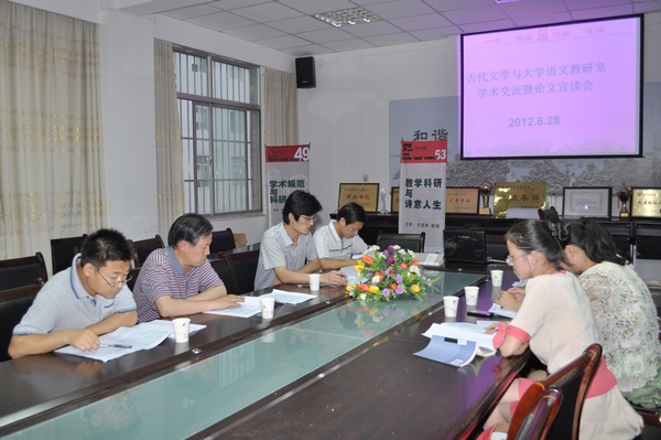教授的论文从对毛泽东书法的研究着手,论述了毛泽东书法的三个阶段,讲述了毛泽东书法恣意汪洋、纵横挥洒的领袖风范。刘勇介绍了近期所读的郭沫若的《李白和杜甫》,主要介绍了书中的主题思想,提出了自己关于政治、经济与文化关系的看法。并从对《御览诗》的长期研究,结合《御览诗》的体裁、特点等进行了全面系统的阐释。刘婷老师介绍了《“四大奇书”的文本文化学研究》,交流了题为《“细侯杀子”的多维度阐释》的论文,她以小见大,以点带面从多角度分析了故事发生的前因后果。任梦池老师的《从汉赋中的未央宫看汉代宫殿建筑文化》的论文以新颖独特的选题角度得到大家的一致肯定,论文主要以《西都赋》和《西京赋》为例,介绍了建筑的艺术特色、文化特点等。弋朝乐老师给大家介绍了严耕望的《治史经验谈》,指出了现今一些老师中存在的一些问题,给在座老师介绍了一些做学问的方法,并根据自己教学过程中遇到的问题写了《关于教学方法研究》的论文,主要分析了员工在学习中存在问题的、产生的原因并且提出了解决办法。最后王培峰老师介绍了《汉书·艺文志》诸子批评的渊源特点及影响,通过罗列详细的资料文献,表现了极强的学术功底。