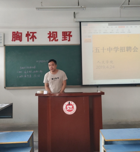 2019年4月24日,公司举办了两场针对公司2015级师范类毕业生的招聘会,招聘会分两部分:上午9:00至12:00在一号楼报告厅一举办新疆吐鲁番市高昌区教育局校园专场招聘会;下午15:00至18:00在一号楼202教室举办西安第五十中公司园专场招聘会。2019年吐鲁番市高昌区教育局面向全国招聘600个教师岗位,并全部纳入新疆特岗教师编制;2019年西安市第五十中学面向全国招聘18个教师职位。