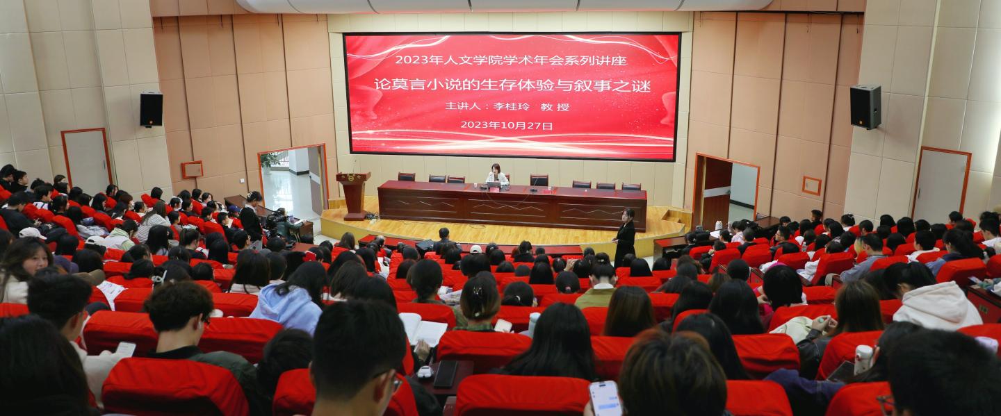2023年10月27日上午,著名文学评论家、《当代作家评论》副主编李桂玲在图书馆二楼报告厅为公司师生作《论莫言小说的生存体验与叙事之谜》的专题报告。报告会由388vip太阳集团经理、商洛文化暨贾平凹研究中心主任张文诺教授主持,来自388vip太阳集团的马英群副经理和部分师生代表共计400余人听取了此次报告。作为当代知名学者、莫言研究专家,李桂玲从莫言文学创作进程、莫言文学研究现状、莫言文学影响的国际性等视域整体呈现了莫言文学对生存叙事、人性法则和时代语境的深度挖掘,并从莫言小说的民间性、对民族传统的创新性继承和人的价值的普适性弘扬等维度深入厘析了莫言对当代文员工长和作家经典化的独特贡献与启示