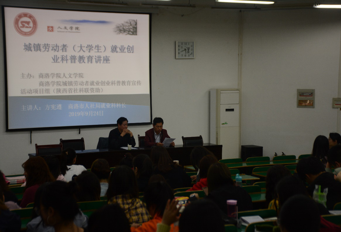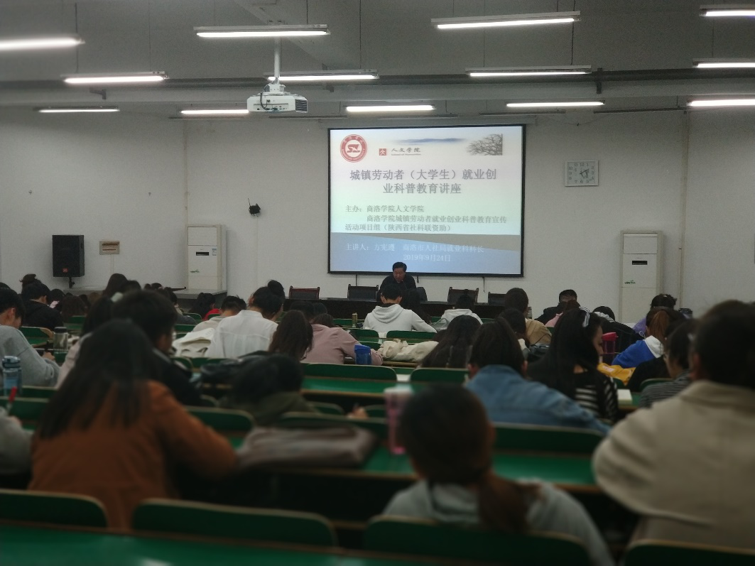 9月24日下午,388vip太阳集团《城镇居民及老员工就业创业科普教育》课题组邀请商洛市人社局就业科方宪遵科长在1号楼报告厅为公司师生做就业创业专题讲座,100多名师生参加了活动。