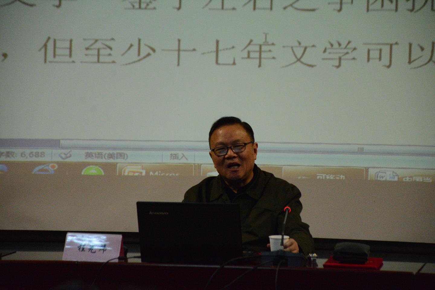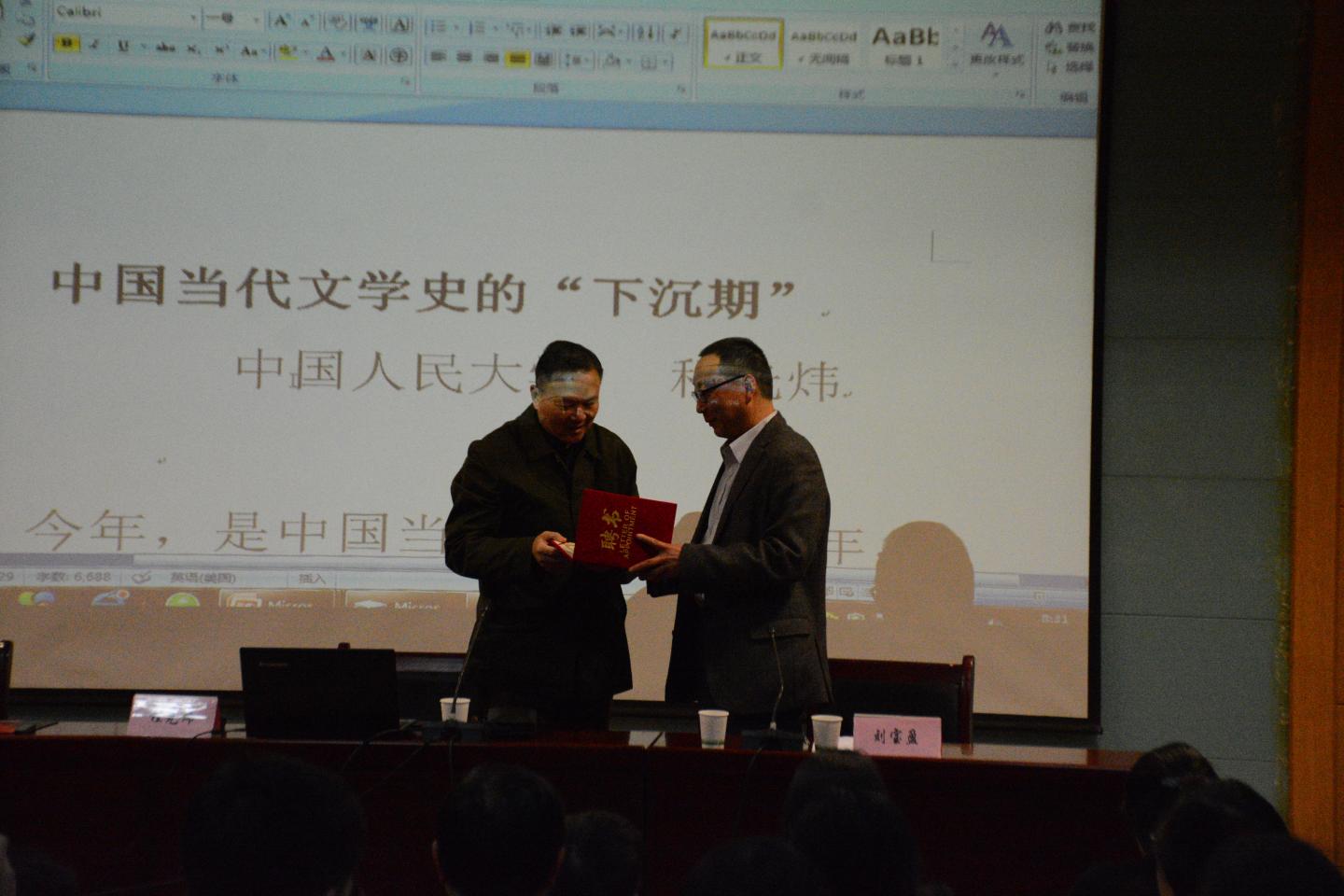 聘任仪式结束后,程光炜教授作了题为《中国当代文学史的‘下沉期’》的学术报告。在报告中程教授谈到中国当代文学应从目前的侧重评论层面转向学术研究层面,在这个转向的过程,研究者应占有丰富的史料,具备深厚的理论根底和文学史眼光来推动中国当代文学史的研究。