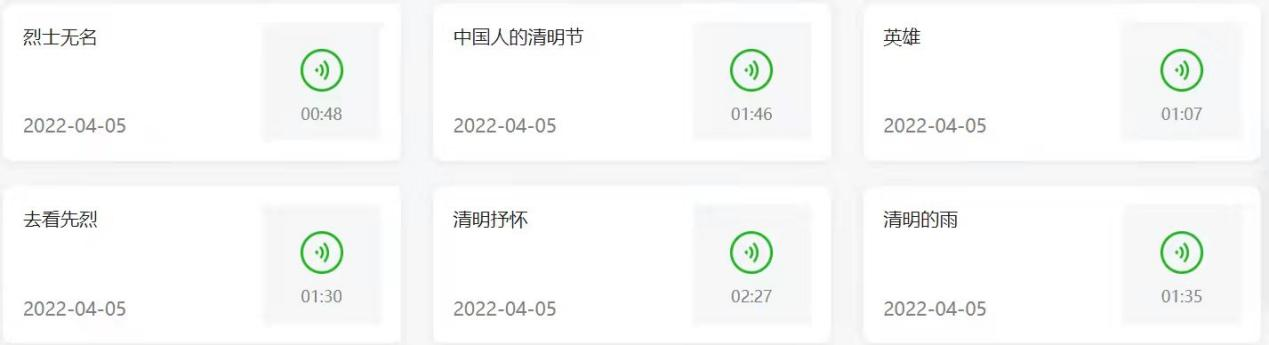 与此同时,本次线上诵读活动采用录音投稿的形式进行,用声音传递正能量,用行动寄托追忆,表达哀思,向为民族复兴、国家富强而作出贡献的先烈们致敬。每一次声音的回响,都是对革命先烈们最真挚的缅怀,是对红色基因最好的延续。