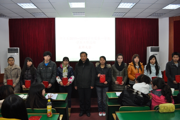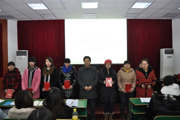 会议对孔嘉曦等 7 名学习标兵,刘明星等 5 名工作标兵,赵地等 4 名德育标兵,乔文博、师小娜两位优秀工作者,胡倩楠等 17 名“团日活动”优秀个人及 11 级汉语言文学 2 班和 11 级语文教育 2 班团支部进行了表彰。 11 汉语言文学 2 班孔嘉曦代表受表彰先进个人作了发言。
