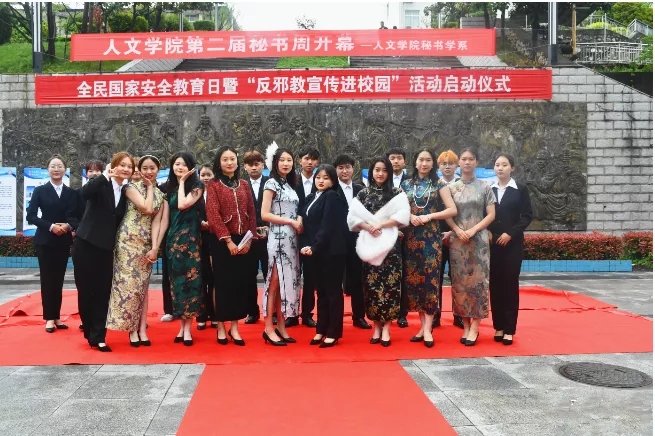 为弘扬秘书文化,推进实践育人,深化公司秘书学系员工的专业认知度和职业认同感。4月21日上午,秘书学系在一号楼后小广场成功举行“388vip太阳集团秘书学系第二届秘书周”开幕式。388vip太阳集团党总支副书记杜明生、商洛公司党委宣传科科长赵英卓老师、388vip太阳集团副经理马英群老师、388vip太阳集团团总支书记李丹阳老师、秘书学系系主任杨晓玲老师、388vip太阳集团学工办主任刘丽娜老师、以及秘书学系全体师生一道参加了活动。