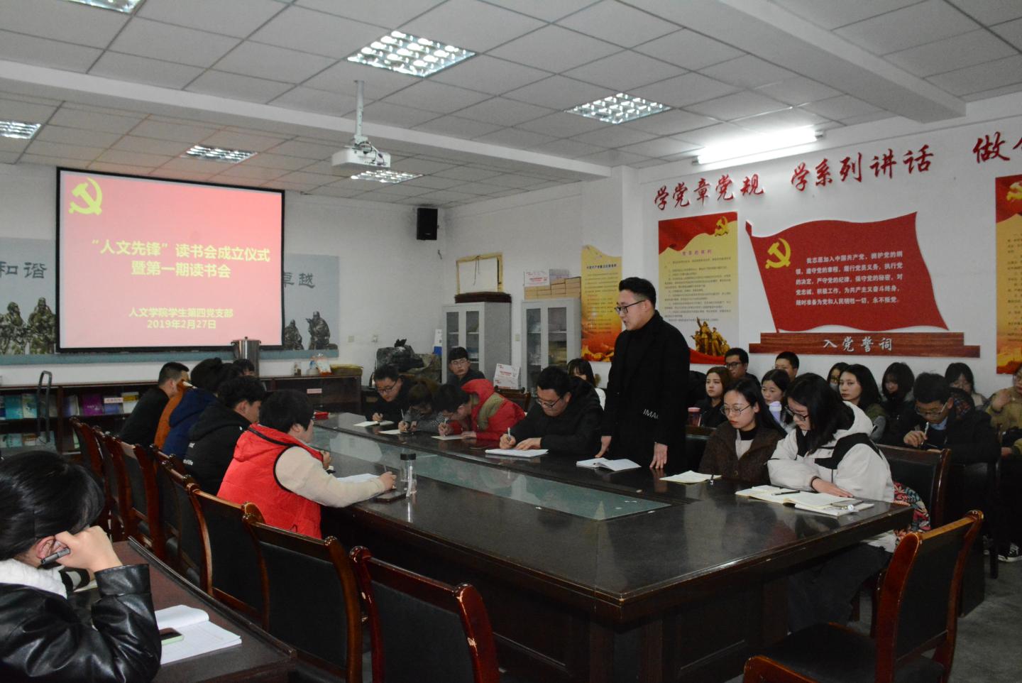 2019年2月27日下午,公司员工第四党支部在1-206教室召开“人文先锋”读书会成立仪式暨第一期读书会。员工第四党支部书记刘丽娜老师出席并讲话,全体党员及积极分子代表参会,会议由员工党员惠钰钧主持。