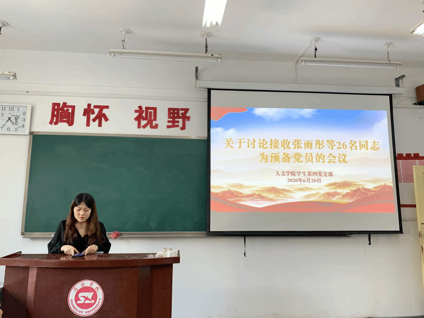 公司员工第四党支部于9月4日下午4:30在一号教学楼202教室召开关于讨论接收张雨彤等26名同志为预备党员的会议,公司员工第四党支部支部书记刘丽娜老师出席了此次会议,支部全体党员、发展对象以及部分积极分子参加了会议,会议由董婉莹主持召开。